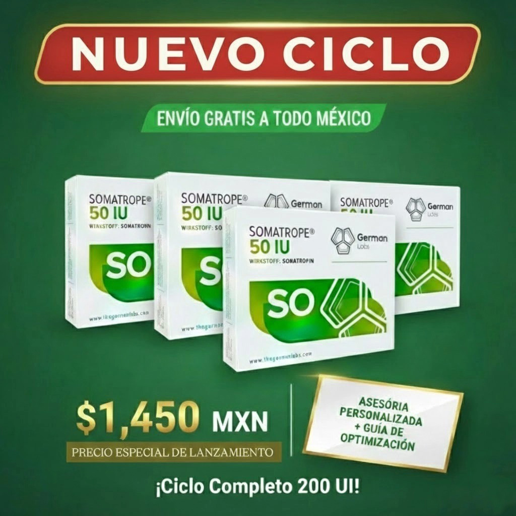¿Qué incluye este ciclo? ▶️ 4 frascos de SOMATROPE GERMAN LABS de 50 UI cada uno ✔️ Total: 200 UI de hormona de crecimiento (GH / somatotropina) ✔️ Duración aproximada: 2 a 3 meses, según protocolo y objetivo individual ▶️ Asesoría personalizada completa Acompañamiento profesional sobre el uso correcto de la hormona de crecimiento, ajuste de dosis, horarios de aplicación y estrategias complementarias para elevar los resultados al máximo nivel. ▶️ Guía de optimización del ciclo Incluye recomendaciones sobre nutrición, suplementación y descanso para potenciar el efecto anabólico y lipolítico del ciclo. PROMOCIÓN OCTUBRE ✅ Ciclo completo: 4 frascos SOMATROPE GERMAN LABS (200 UI) Envío totalmente GRATIS a todo México Incluye asesoría personalizada + guía de optimización del ciclo. Precio especial de lanzamiento: $1,450 MXN
